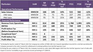 - Combined volume of CNG and PNG achieved @ 166 MMSCM vs 145 MMCM in Q4 FY20