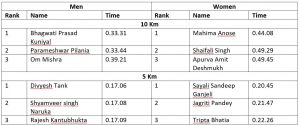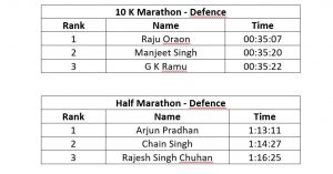 - The winner of half marathon in the defense category are Raju Oraon, Manjeet Singh and G K Ramu, Arjun Pradhan, Chain Singh and Rajesh Singh Chuhan