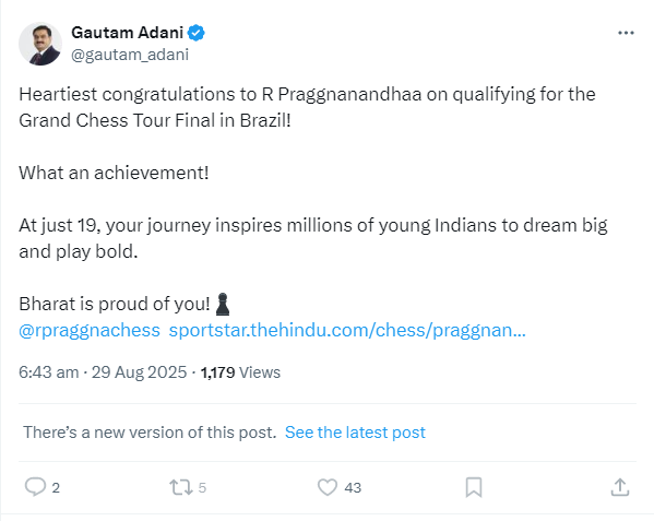 Adani Group Chairman Gautam Adani posted on social media and said, Heartiest congratulations to R Praggnanandhaa on qualifying for the Grand Chess Tour Final in Brazil! What an achievement! At just 19, your journey inspires millions of young Indians to dream big and play bold. Bharat is proud of you!