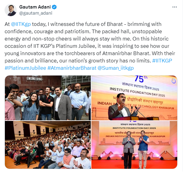 He announced the Adani–IIT Platinum Jubilee Change Makers Fellowship, to be launched across all IITs and coordinated by IIT Kharagpur, to channel top talent into projects aligned with national priorities. Mr Adani also proposed the creation of “living laboratories” with IIT Kharagpur in areas such as renewable energy, logistics and smart airports, linking academia with corporate execution.
