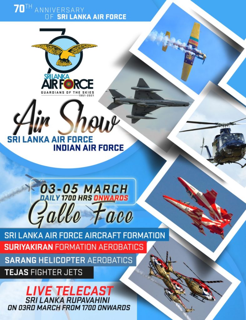 The Suryakirans, Sarang and LCA Tejas will participate in an Air Show at Galle Face, Colombo, scheduled from 03–05 Mar 21 as part of the 70th anniversary celebrations of SLAF.
