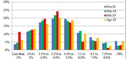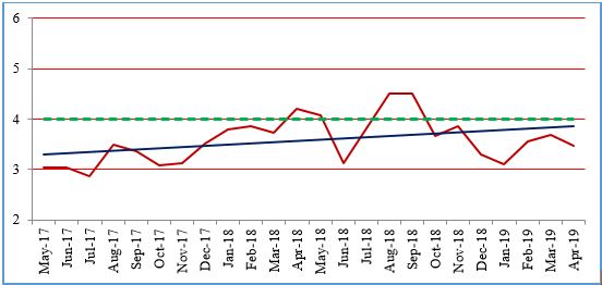 - Regarding cost perceptions, around 50% of the firms in April 2019 reported that increase in costs has been more than 3% (sharply down from 57% reported in March 2019) during the last one year (Chart 3).