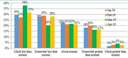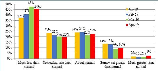 - In April 2019, nearly 3/5th of the firms in the sample reported that sales are ‘somewhat or much less than normal’[1] (Chart 4). This proportion has remained similar during Jan-April 2019 period.