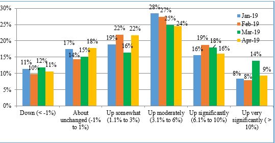 - The proportion of firms perceiving significant cost increase (more than 6%) in April 2019 has also come down sharply to 25% as compared to 32% in March 2019.