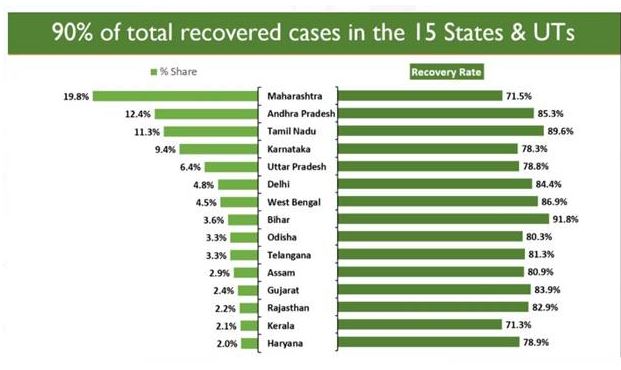 According to the government records, 90% of the new recovered cases had been reported from 16 States/UTs, while the 90 per cent of the total recovered cases were reported from 15 states and UTs. And of the total recovered cases, more than 60 per cent has been reported from five States, viz. Maharashtra, Tamil Nadu, Andhra Pradesh, Karnataka and Uttar Pradesh.