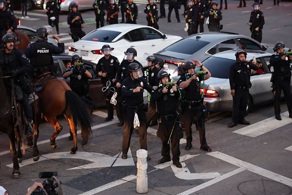 In what has become a daily ritual, police forced demonstrators away from the streets outside the Metropolitan Detention Centre, where many detained migrants are held. Multiple groups of protesters snaked through downtown Los Angeles, monitored or followed by police armed with less lethal munitions.