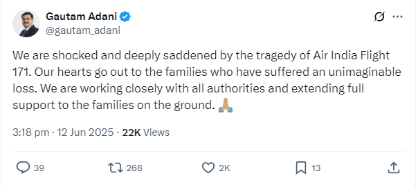 Adani Group Chairman Gautam Adani posted on social media, We are shocked and deeply saddened by the tragedy of Air India Flight 171. Our hearts go out to the families who have suffered an unimaginable loss. We are working closely with all authorities and extending full support to the families on the ground.