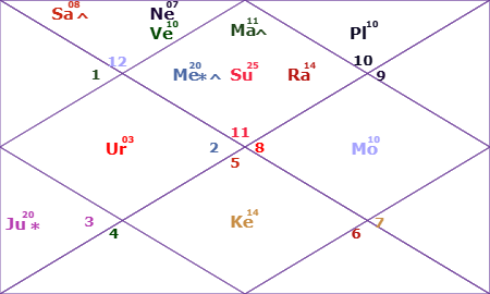 - Moon Sign: Scorpio (Anuradha / Jyeshtha) – Debilitated.